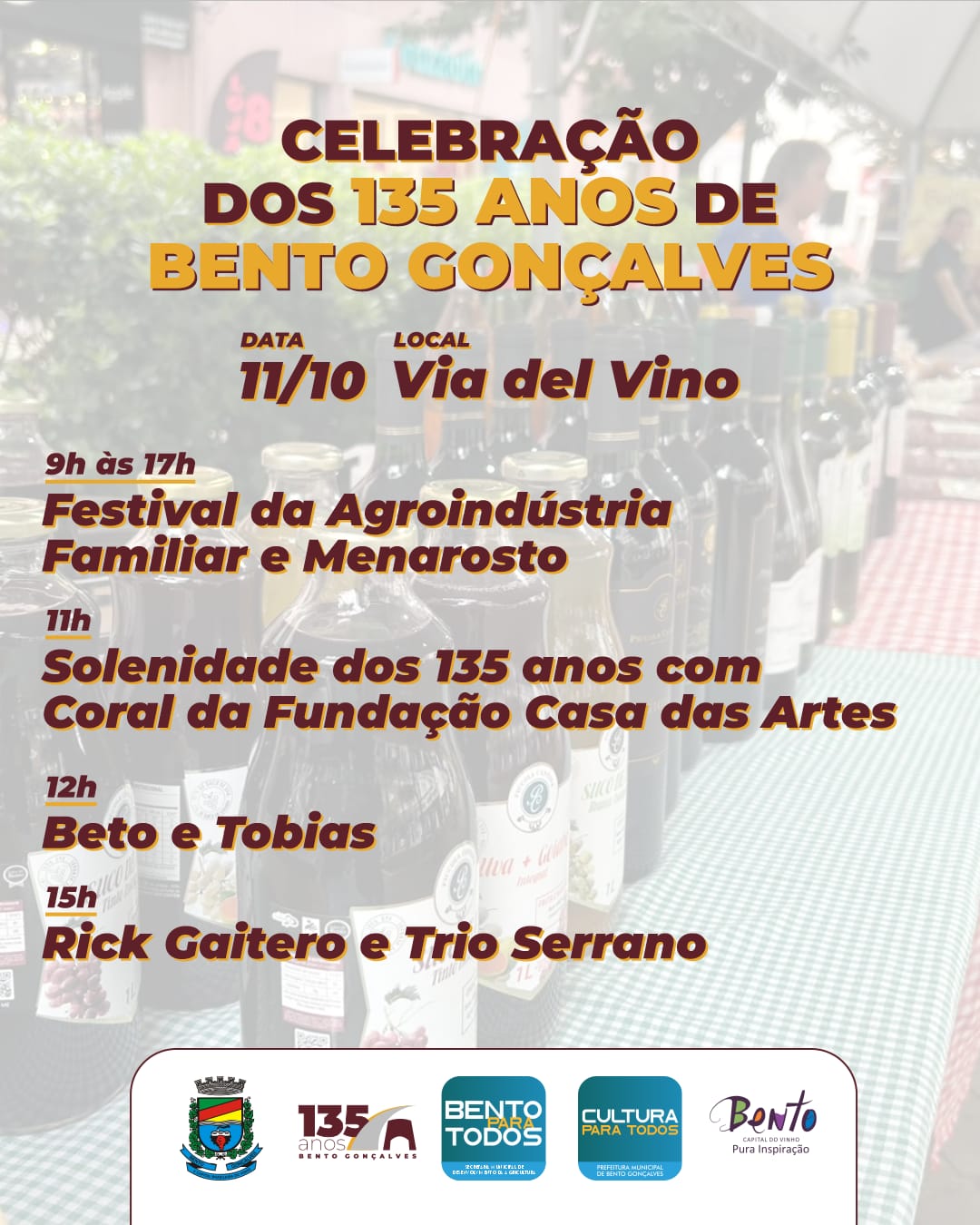 A Capital Brasileira do Vinho, Bento Gonçalves, completa 135 anos neste sábado, 11 de outubro. Para celebrar a data, diversas atrações estão sendo preparadas para a população, como o Bento Balonismo, Encontro Antigos BG, Feira do Livro e outras atrações.