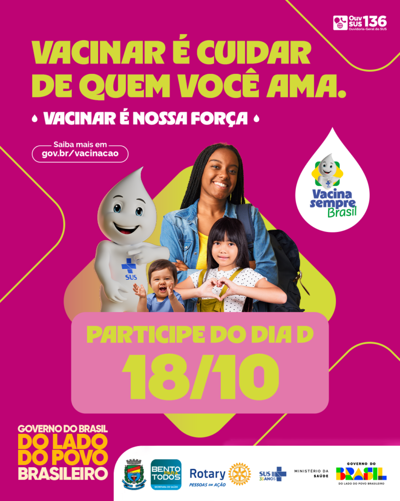 Neste sábado (18) será realizado o Dia D da Campanha Nacional de Multivacinação voltada para o público de até 15 anos. As unidades de saúde estarão abertas para imunização. Durante a campanha, todas as vacinas previstas no Calendário Nacional de Vacinação 2025 estarão disponíveis, incluindo imunizantes contra poliomielite e covid-19, contemplando os esquemas vacinais de crianças e adolescentes. Entre as prioridades, estão o resgate de não vacinados contra sarampo, HPV e MeningoC e Meningo ACWY. Para a coordenadora do setor de imunizações Daiane Orio “é um momento importante para atualização da caderneta de vacinação. Estaremos com todas as unidades abertas e disponibilizando a vacinação. Pedimos aos pais que aproveitem o sábado para cuidar das crianças e adolescentes”, destaca. A imunização está disponível nas unidades de saúde das 7:30 às 13h. Exceto COHAB, Progresso, Faria lemos, São Valentin e 15 da Graciema Confira as imunizações: BCG – Hepatite B – Penta (DTP/Hib/HB) Poliomielite inativada Rotavírus Pneumocócica 10 valente (conjugada) Meningocócica C (conjugada) / Meningocócica ACWY (conjugada) Influenza – Covid-19 Febre amarela Tríplice viral (sarampo, caxumba e rubéola) Tetra viral (sarampo, caxumba, rubéola, varicela) Varicela – DTP – DT Hepatite A HPV Assessoria de Comunicação Social Prefeitura