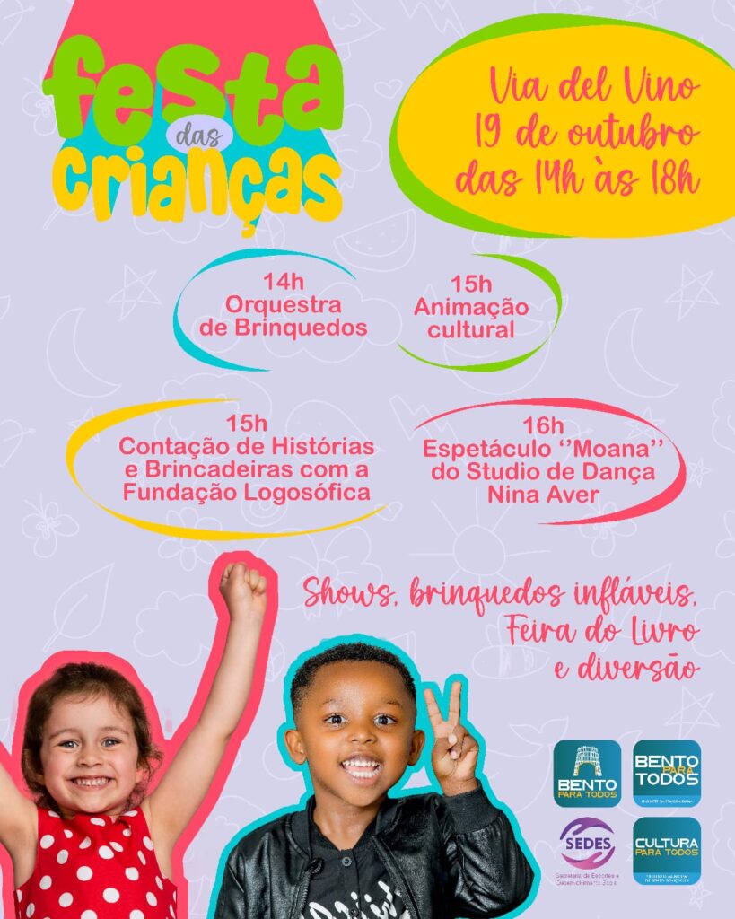 No dia 19 de outubro, a Prefeitura, através das Secretarias de Esportes e Desenvolvimento Social (Sedes), Gabinete da Primeira Dama e Secretaria de Cultura (Secult), realiza a Festa da Criança, na Via del Vino. O evento gratuito acontece das 14h às 18h. A tarde de diversão contará com brinquedos infláveis, shows, atrações culturais e lanches. “Estamos reservando um momento especial para celebrar com as crianças com brinquedos, shows e muita diversão”, destaca o secretário Eduardo Virissimo. No dia, a Feira do Livro estará em andamento. “Um momento especial, enquanto a garotada se diverte nos brinquedos, os familiares podem aproveitar a Feira do Livro e suas atrações”, celebra o secretário de Cultura Evandro Sores. Para a primeira-dama Cláudia Remus “é um evento preparado com muito carinho para toda a família. Queremos que todos possam aproveitar esse dia dedicado para as crianças com muita alegria”. As crianças no espectro autista ou com deficiência poderão aproveitar as atrações com um espaço reservado para elas. Para a realização do evento, será necessário o bloqueio do trânsito na Rua Marechal Deodoro. Programação: 14h – Orquestra de Brinquedos 15h – Animação Cultural no palco da 40ª Feira do Livro – Contação de Histórias e Brincadeiras com a Fundação Logosófica 16h – Espetáculo “Moana”, do Studio De Dança Nina Aver Assessoria de Comunicação Social Prefeitura