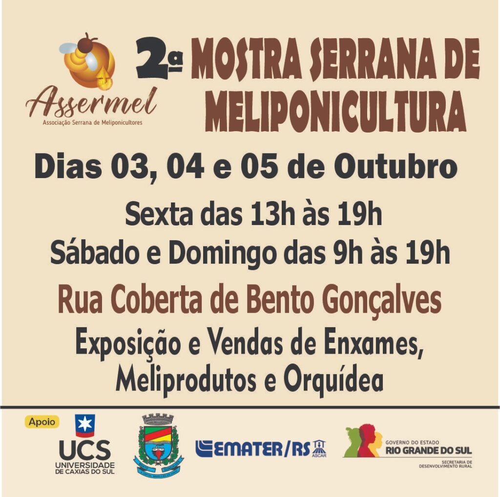 A 2ª Mostra Serrana de Meliponicultura acontece nos dias 03, 04 e 05 de outubro, na Rua Coberta, em Bento Gonçalves. O evento, promovido pela Associação Serrana de Meliponicultores (Assermel) visa celebrar e fortalecer a prática da meliponicultura, trocando saberes sobre as abelhas sem ferrão e seu papel na preservação e produção sustentável. Na oportunidade será realizada exposição e venda de enxames, meliprodutos e orquídeas. O evento conta com apoio da Universidade de Caxias do Sul, Secretaria de Agricultura e Emater. Serviço: 2ª Mostra Serrana de Meliponicultura Quando: dias 03, 04 e 05 de outubro Horário: Sexta-feira das 13h às 19h Sábado e domingo das 9h às 19h Onde: Rua Coberta