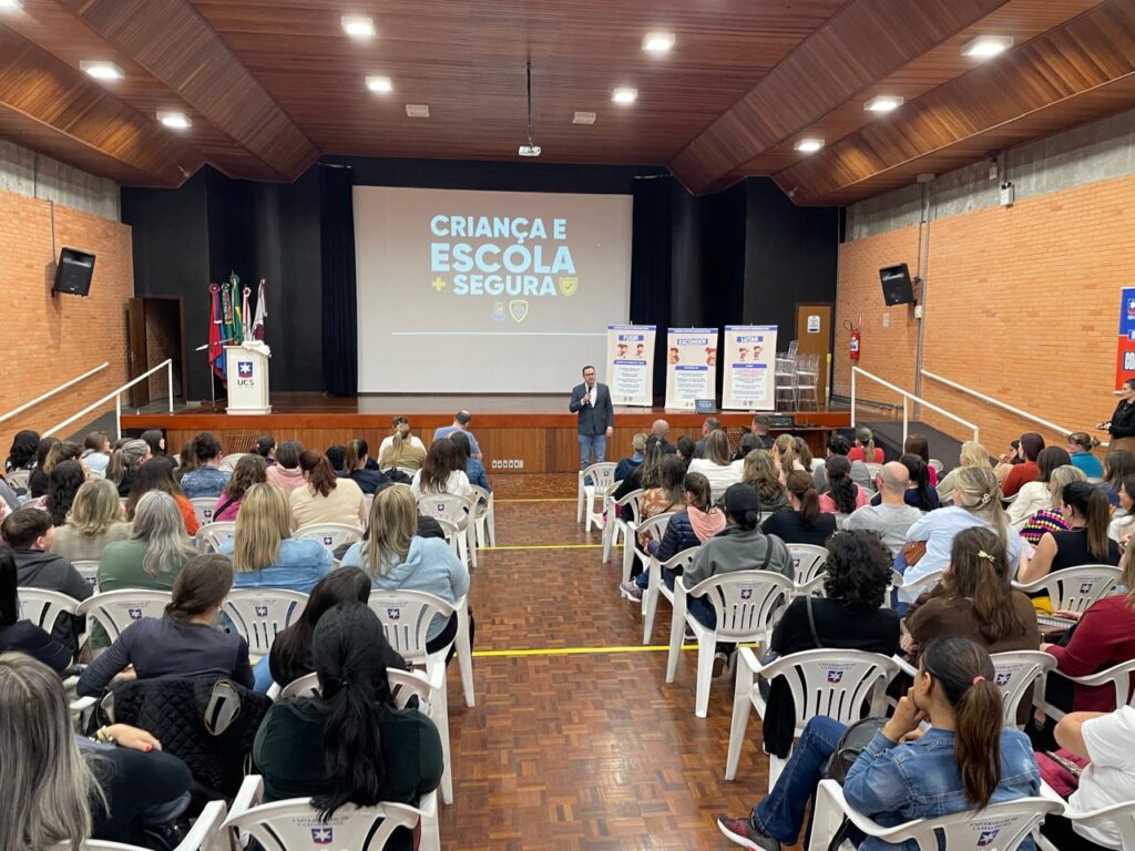 Nesta segunda-feira (29), a Prefeitura de Bento Gonçalves deu sequência nas capacitações dos profissionais da educação sobre violência nas escolas. A ação promovida pela Secretaria de Esportes e Desenvolvimento Social (Sedes), Secretaria de Educação e Segurança foi realizada no auditório da UCS para grupos de profissionais do ensino fundamental. Cerca de 600 profissionais já participaram das atividades. Durante a capacitação, conduzida pelo secretário da Sedes Eduardo Virissimo, foram destacadas informações sobre autoagressão e agressor ativo. Além do protocolo internacional “Fugir, Esconder e Lutar”, como uma estratégia eficaz para responder a emergências. “A cada encontro são novas experiências e ações que começam a ser agregadas ao trabalho. Agora faremos a visita em cada escola e também a capacitação interna na secretaria. Um trabalho contínuo”, disse. Para o prefeito Diogo Siqueira “é uma ação necessária e de prevenção. Estamos buscando unificar o trabalho, manter todos informados e capacitados com ações práticas e diretamente nas escolas”, disse. Estiveram presentes da Secretaria de Educação Luiz Minozzo, secretário de Segurança Gabriel Kellermann, e da Guarda Civil Municipal Cleiton Holzbach. Assessoria de Comunicação Social Prefeitura