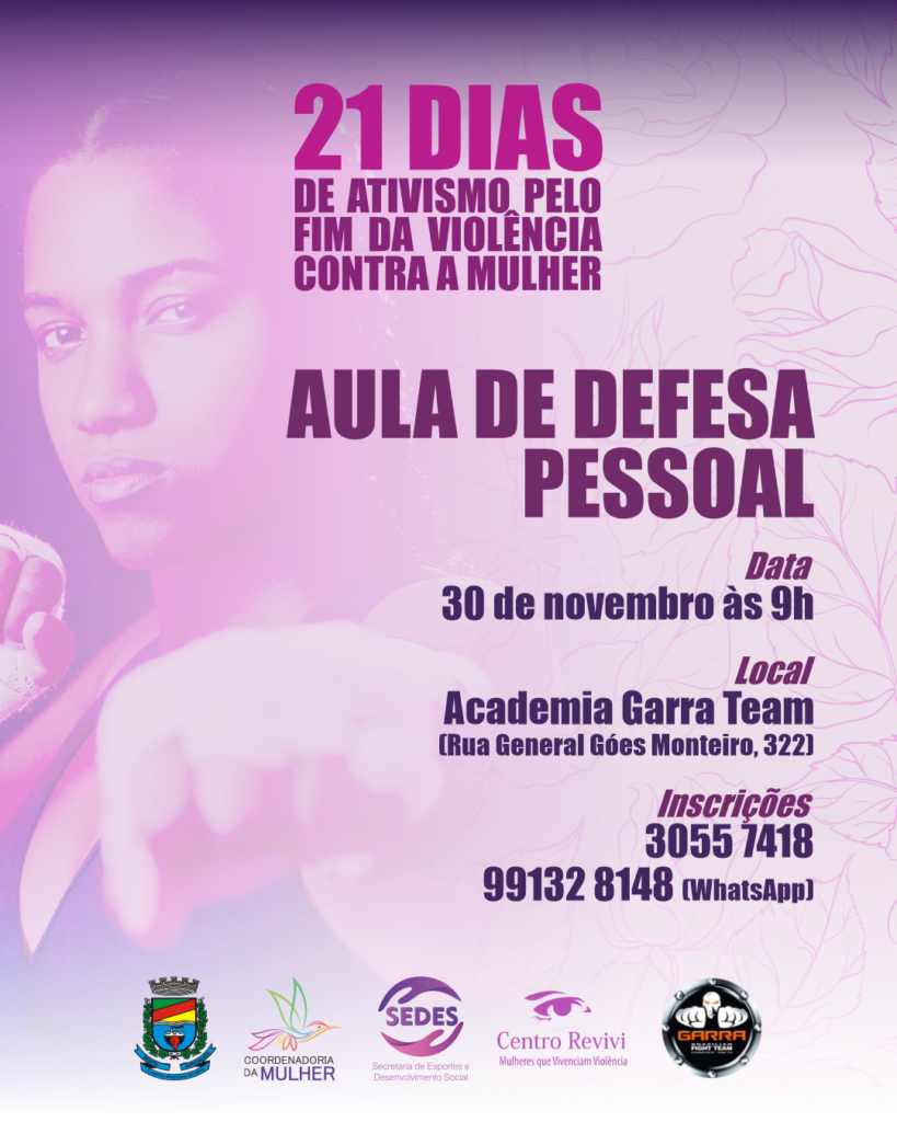 A programação dos 21 Dias de Ativismo pelo Fim da Violência da Mulher e do Racismo segue até 10 de dezembro. A Secretaria de Esportes e Desenvolvimento Social por meio da Coordenadoria da Mulher e do Centro Revivi está realizando ações e atividades que visa ampliar a conscientização coletiva para erradicação deste mal que atravessa a história da sociedade. Pensando em dar mais subsídios para a autointegridade física, no dia 30 de novembro, às 9h, será ministrada pela equipe da Garra Team a Aula de Defesa Pessoal para o público feminino. Os especialistas em artes marciais vão ensinar técnicas para o enfrentamento ataque do agressor como golpes tramáticos e de mobilização. As inscrições estão abertas e podem ser realizadas por meio deste número: (54) 99132.8148 ou 3055.4718. Agenda 21 Dias de Ativismo pelo Fim da Violência contra a Mulher e do Racismo 30/11- 9h – Aula de Defesa Pessoal Academia Garra Team – Academia Garra Tema – Rua Gal. Góes Monteiro, 322