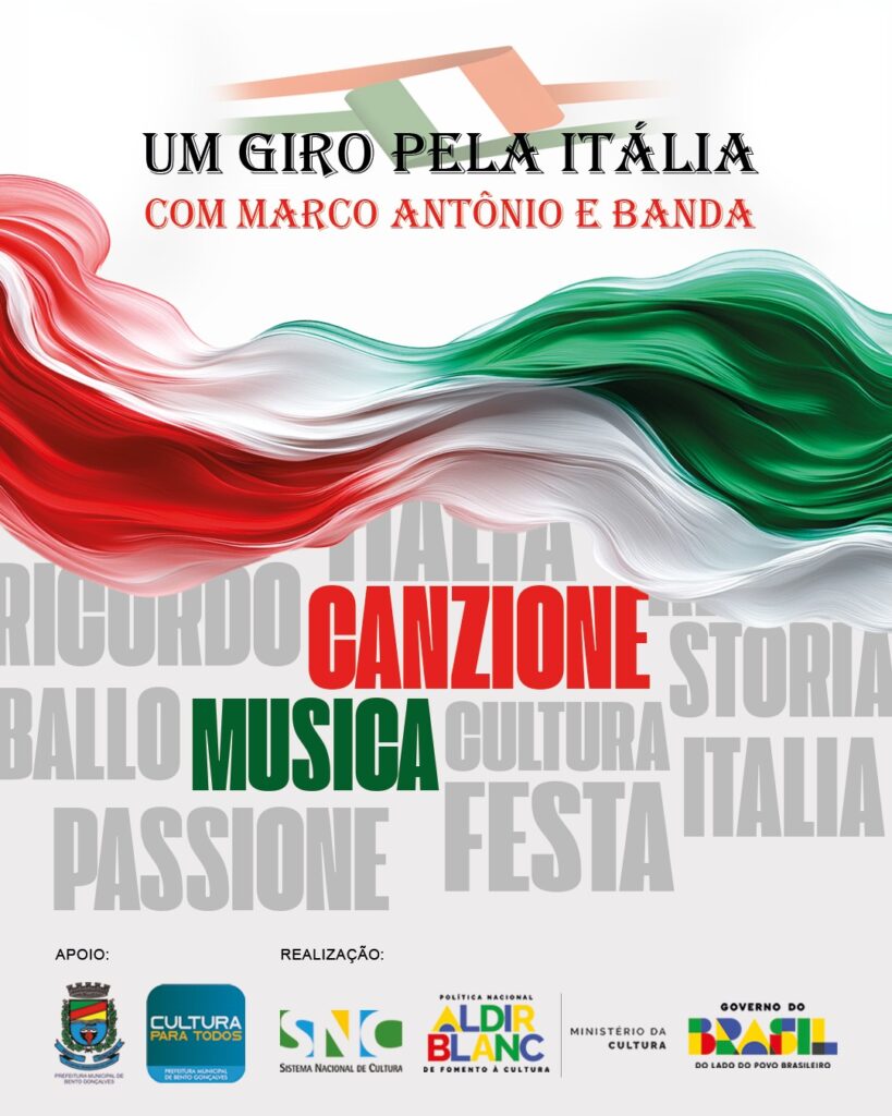 O projeto “Um Giro pela Itália com Marco Antônio e Banda”, viabilizado pela Política Nacional Aldir Blanc de Fomento à Cultura, através do Edital 06/2025 de Bento Gonçalves, realizará apresentações nos próximos meses para a comunidade. Nesta iniciativa, o charme, a alegria e a emoção da cultura italiana vão tomar conta de Bento Gonçalves no domingo, 23 de novembro de 2025, a partir das 13h30, na Praça da Igreja São Roque, com a primeira apresentação do circuito. A estreia será um verdadeiro encontro cultural, com mateada, apoio da Rádio Olé e três apresentações artísticas que prometem encantar o público. A programação contará com Giovane Pinceta (violão clássico) às 14h, o show “Um Giro pela Itália com Marco Antônio e Banda” às 15h, e o encerramento com o Grupo Quarto Gole às 16h. O evento será gratuito e aberto à comunidade. O projeto propõe um circuito com quatro apresentações em diferentes locais da cidade, todas gratuitas, com as próximas três datas ainda a serem anunciadas. O objetivo é levar arte, música e tradição às praças e comunidades do município, celebrando a marcante herança da imigração italiana, que completa 150 anos no Brasil. “Um Giro pela Itália com Marco Antônio e Banda” é um espetáculo e uma viagem cultural e afetiva. No palco, o cantor Marco Antônio, reconhecido por sua trajetória voltada à música italiana, se apresenta ao lado de sua banda e de bailarinos, em um show que une música, dança e cenografia temática. O repertório inclui clássicos italianos e canções populares, além de momentos interativos que convidam o público a cantar, relembrar histórias e se conectar às raízes que moldaram a identidade da Serra Gaúcha. A proposta é valorizar e difundir a cultura italiana por meio da arte, reforçando laços entre gerações e promovendo o acesso à música e à dança em diferentes localidades de Bento Gonçalves. As apresentações gratuitas em áreas periféricas e no interior do município buscam democratizar o acesso à cultura, integrando comunidades e fortalecendo o sentimento de pertencimento. Programação 13h30 – Início da mateada 14h – Giovane Pinceta (violão clássico) 15h – Marco Antônio e Banda 16h – Grupo Quarto Gole Local: Praça da Igreja São Roque Entrada franca
