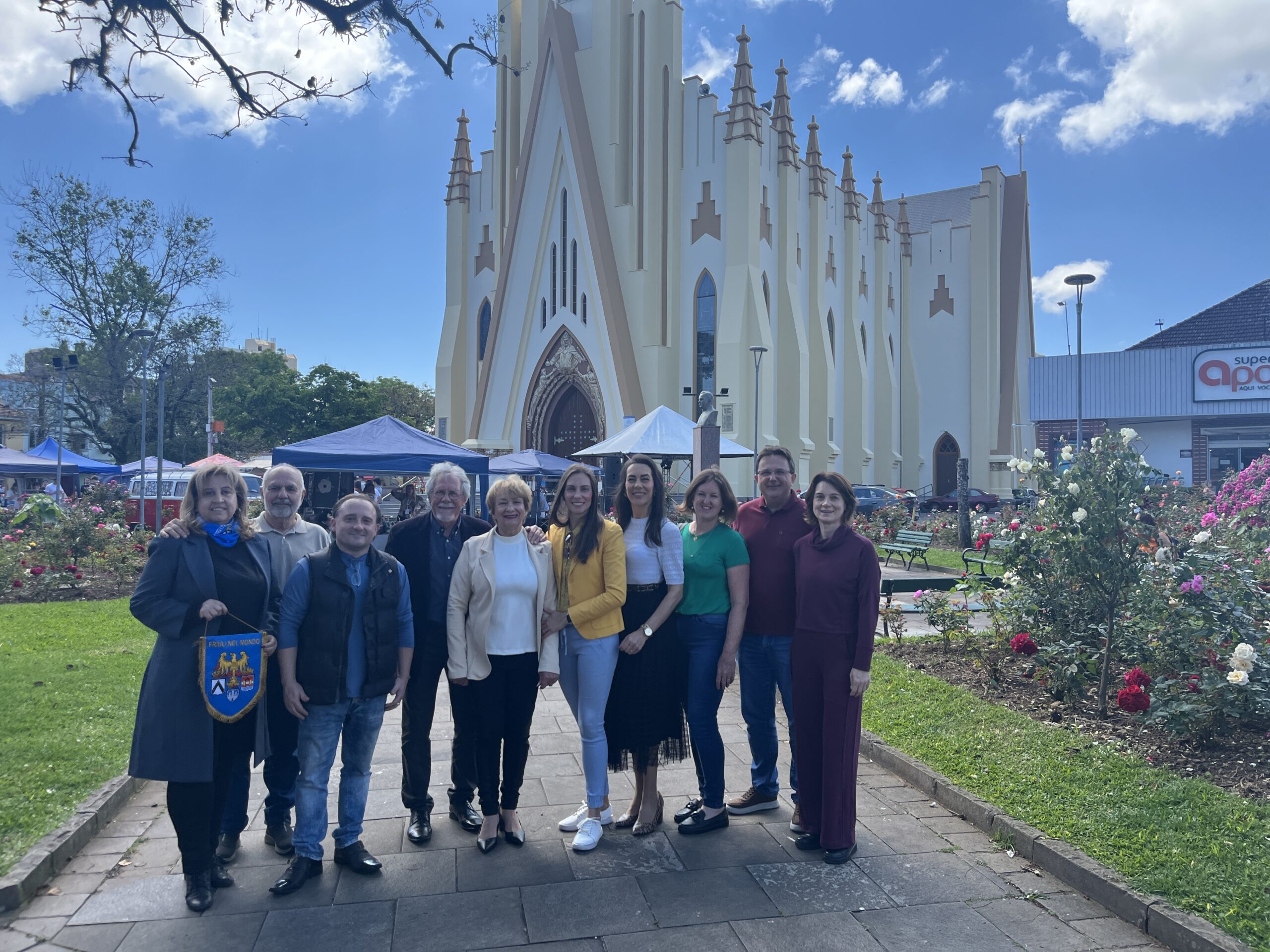 Legenda: Comissão à frente do monumento ‘Legado de Esperança’ envolve Dorvalino Sonaglio e Família (Marli D. Sonaglio, Patrícia D. S. Scarton e Lesandra D. S. Dalla Costa); Circolo Friulano da Serra Gaúcha, presidido por Lisete Furlan Canabarro; Circolo Trentino di Bento Gonçalves, representado por Sandro Giordani, grupo União de Imigrantes Trevisani Nel Mondo de Bento Gonçalves, presidido por Valter Ricardo Moro, e tem o apoio da Prefeitura de Bento Gonçalves
