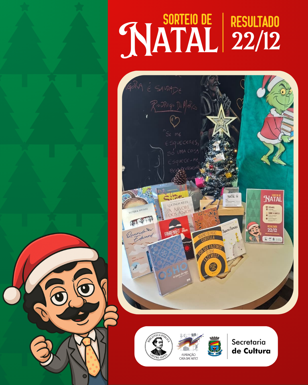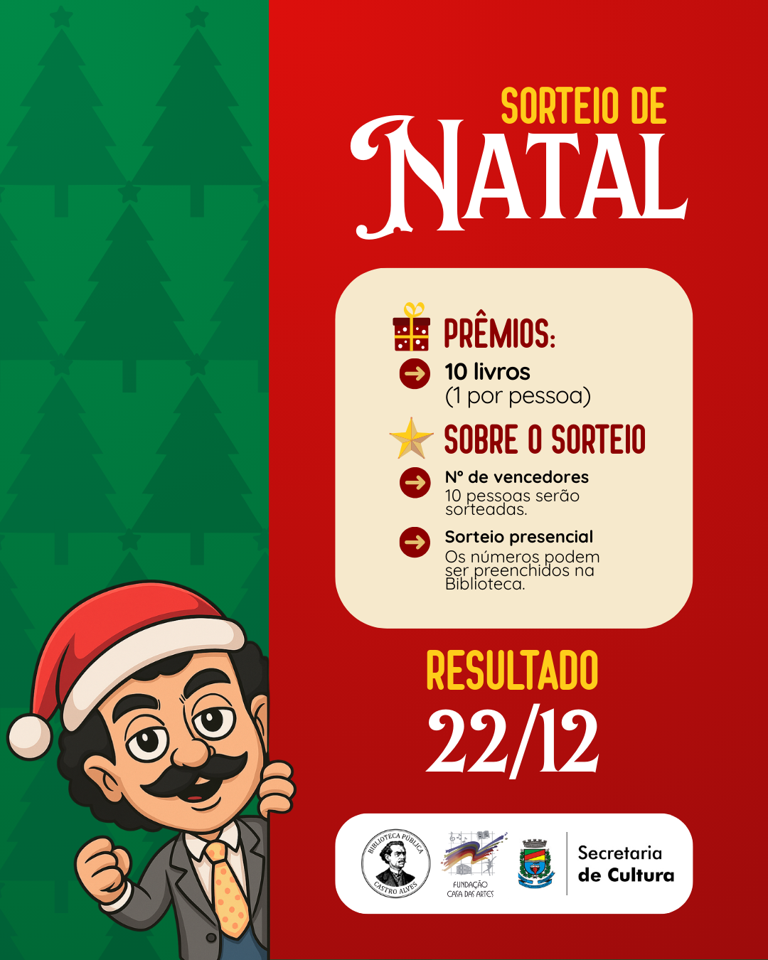 Ainda, a campanha conta com o sorteio especial de Natal que será realizado na Biblitoeca, o qual premiará 10 leitores que receberão um livro para aproveitar durante as festas de fim de ano. O resultado será divulgado no instagram @bibliotecapublicacastroalvesbg, no dia 22 de dezembro. Para participar, basta preencher a ficha de participação na Biblioteca.