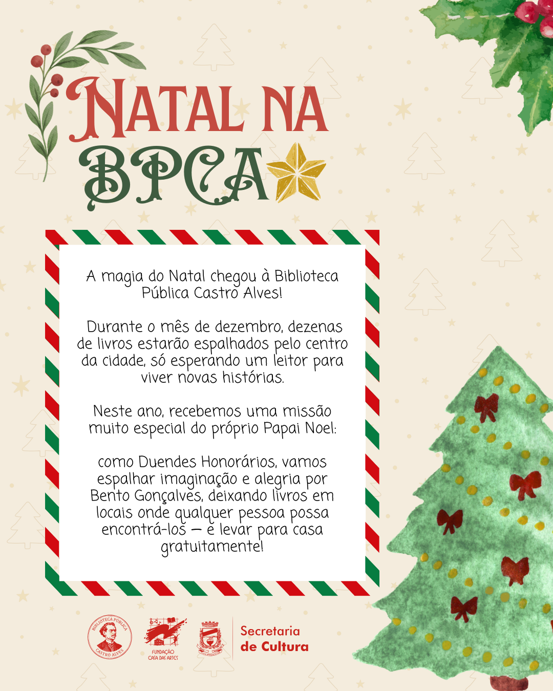 Durante todo o mês de dezembro, a Biblioteca Pública Castro Alves promove a edição natalina do projeto Livro Encontrado, incentivando a leitura por meio da distribuição gratuita de livros em locais de livre circulação no Centro de Bento Gonçalves, que ocorre nos dias 06 e 20 de dezembro. Ao encontrarem os exemplares, os cidadãos de todas as idades poderão levar o exemplar para casa e adentrar em novas aventuras.