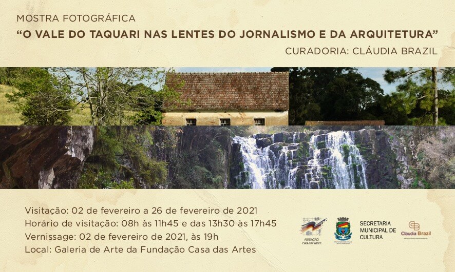 A partir do dia 2 de fevereiro, a Fundação Casa das Artes recebe a mostra fotográfica “O Vale do Taquari nas Lentes do Jornalismo e da Arquitetura”. O projeto, que possui curadoria de Cláudia Brazil, evoca dois olhares, da arquiteta e urbanista Djulia Marder, e do jornalista, fotógrafo e escritor Alício Assunção.