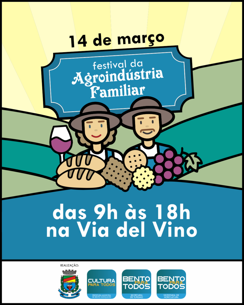 No próximo sábado (14), a Via del Vino será palco de um dia especial com agricultura, dança, gastronomia típica, música e pisa das uvas, integrando a programação do Bento em Vindima. Das 9h às 18h, acontece o Festival da Agroindústria Familiar, com a comercialização de produtos coloniais como pães, biscoitos, cucas, vinhos, geleias, entre outros produtos. A programação cultural contará com apresentações da Orquestra de Faria Lemos, Projeto Coração Cidadão, William Hammon, Nona Gema, Coral da Fundação Casa das Artes e Beto e Tobiás. O evento é uma realização das Secretarias de Turismo, Desenvolvimento da Agricultura e Cultura. “Mais um evento para celebrar a Vindima e para valorizar nossas agroindústrias familiares. Convidamos todos para participarem de mais essa edição do festival” , celebra o secretário de Turismo, Henrique Nuncio. Confira a programação: 11h Orquestra de Faria Lemos 12h Pisa da uva 13h Projeto Coração Cidadão 14h Willian Hammom 15h Coral da Fundação Casa das Artes 16h Espetáculo: Nona Gema e os segredos da longevidade 17h15 Beto e Tobiás Assessoria de Comunicação Social Prefeitura
