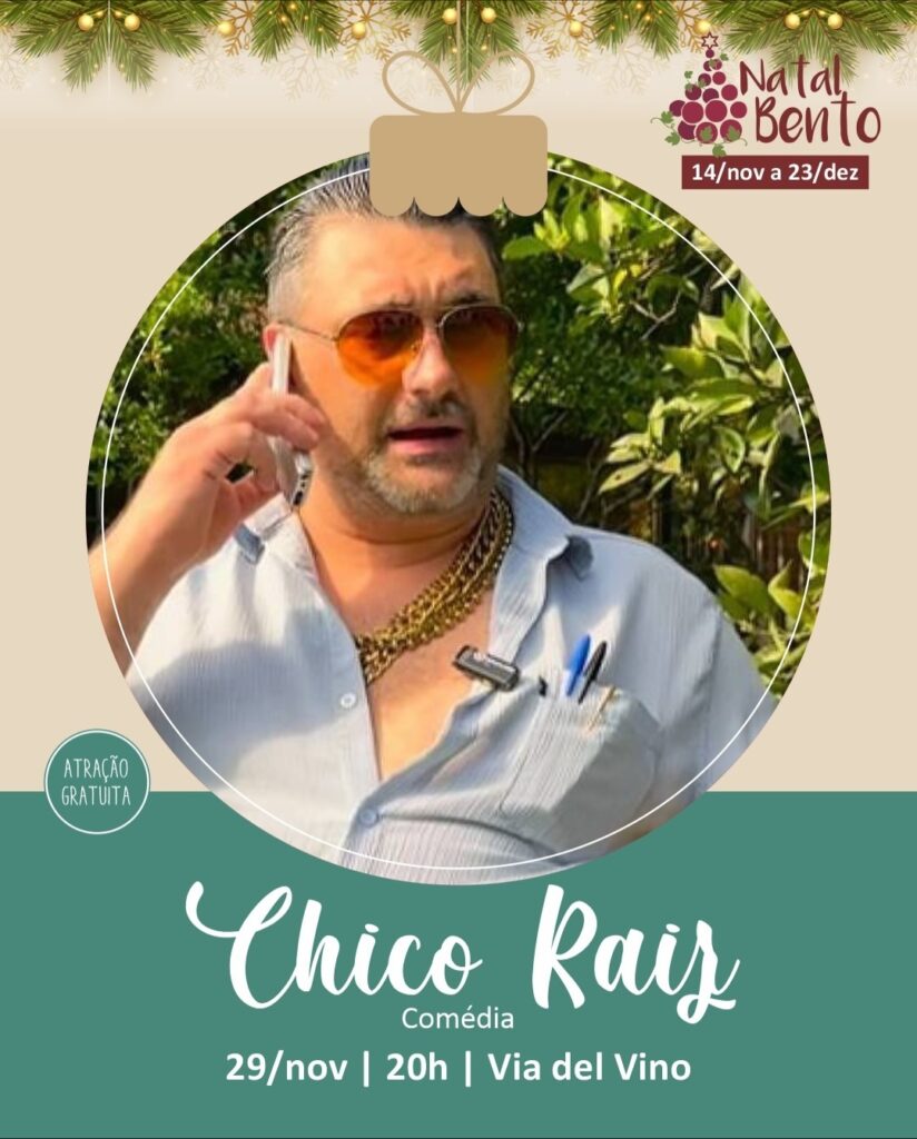 A programação do Natal Bento segue intensa neste fim de semana com diversas atrações na Via del Vino e no Vale dos Vinhedos. Sexta-feira (28)As atividades começam às 18h30, com a apresentação do Colégio Marista Aparecida, reunindo 80 crianças no palco da Via del Vino. Às 20h, o grupo Cavatappi apresenta o espetáculo Un Natale Favoloso, trazendo ao público o encanto da música italiana. No mesmo dia, inicia-se também a programação do Natal nos Vinhedos, promovida pelo CIC-BG. A partir das 19h, a reconhecida Família Lima se apresenta no palco montado entre os parreirais no Vale dos Vinhedos. Sábado (29)A Igreja Santo Antônio recebe o Encontro de Coros Natalinos. Já na Via del Vino, a programação segue com a apresentação dos Canarinhos, às 19h, e com o humorista Chico Raiz, a partir das 20h. Francisco Cechin Junior, que viralizou com vídeos e esquetes satirizando vendedores e a rotina do Sul, interpreta o personagem de sotaque serrano, visual marcante e dono do famoso “Bar do Chico”. No Vale dos Vinhedos, ocorre a apresentação do espetáculo Christmas Celebration. Domingo (30)A partir das 19h30, o grupo P1oito realiza uma apresentação de dança na Via del Vino. Em seguida, às 20h, o artista Thomaz Machado sobe ao palco com o espetáculo Natal eh O de Casa. Em caso de chuva, a programação do domingo será transferida para a Fundação Casa das Artes. Segundo o secretário de Turismo, Henrique Nuncio, “é uma programação especial que dá continuidade às atrações do Natal Bento. Também neste fim de semana o Natal nos Vinhedos chega com suas atrações entre os parreirais. Convidamos todos para aproveitarem”, destacou. Confira a programação: 28/11 – Via del Vino 18:30 Apresentação Colégio Marista 20h Un Natale Favoloso: Apresentado por Cavatappi (Música Italiana) 19h Natal nos Vinhedos – Família Lima (promoção CIC- BG) 29/11 -Igreja Santo Antônio 19:30 “Encontro de Coros Natalinos: Casa das Artes, Tacchini, Santo Antônio (músicas católicas e natalinas cantadas pelos 3 corais do Maestro)” Via del Vino 19h Os Canarinhos 20h Comédia: Chico Raiz 19h Natal nos Vinhedos – Christmas Celebration 18:40 e 21:00 Natal Sobre Trilhos – Giordani Turismo 30/11 – Via del Vino 18:30 Reconectar Arte (P1oito Estúdio de Dança) 20h Natal é Oh de Casa com Thomas Machado Assessoria de Comunicação Social Prefeitura
