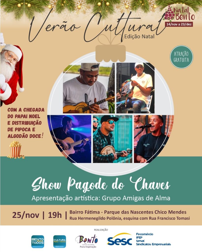 Nesta segunda e terça-feira (15 e 16), a Edição Especial do Verão Cultural segue sua programação nas comunidades. No bairro São Roque as atrações artísticas serão conduzidas pelo Pagode do Chave e pela EEEF General Amaro Bitencourt. Em caso de más condições climáticas, o evento será transferido de local para as dependências do SCFV Balão Mágico, Rua Giácomo Baccin, 667, bairro Aparecida. Já no Licorsul, na Capela Santa Catarina, terá a apresentação do Pagode do Chaves e da EMI Espaço dos Sonhos. Em caso de más condições climáticas, o evento será transferido de local que será anunciado em breve. Em todas as datas, o público será recebido com a chegada do Papai Noel, que participa das atividades com crianças e famílias e haverá distribuição de pipoca e algodão-doce. A edição especial de Natal do Verão Cultural é realizada pelo Sesc em parceria com a Prefeitura Municipal, por meio das Secretarias de Cultura, de Turismo e de Educação e integra a programação oficial do Natal Bento. Programação 15/12 – São Roque SHOW PAGODE DO CHAVES Apresentação artística: EEEF General Amaro Bitencourt Local: Praça São Roque – Paróquia São Roque (R. Ricardo Fianco, 06 – São Roque) Horário: 19 horas 16/12 – Licorsul SHOW PAGODE DO CHAVES Apresentação artística: EMI Espaço dos Sonhos Local: Bairro Licorsul (Capela Santa Catarina – Rua Rosa Tesheiner, 130) Horário: 19 horas Assessoria de Comunicação Social Prefeitura