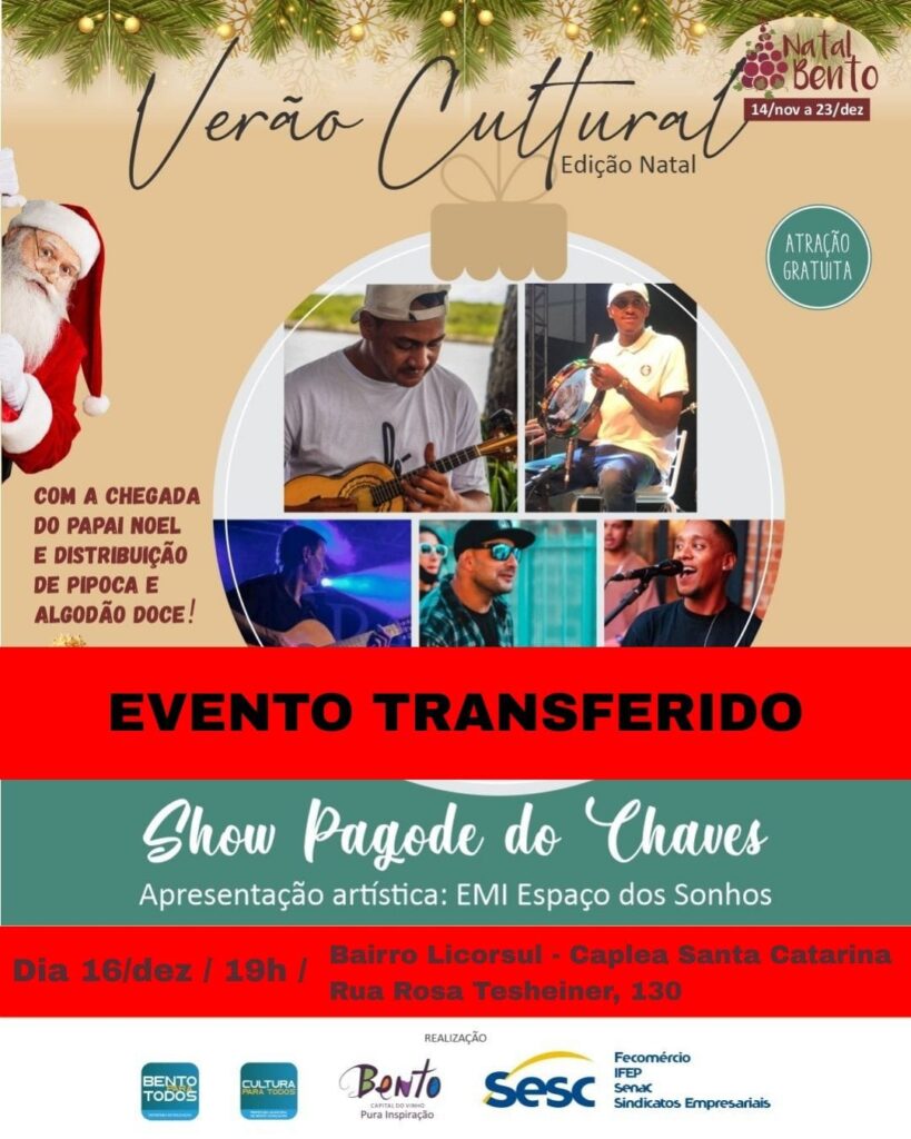 Evento conta com as apresentações artísticas de educandários dos bairros e do Pagode do Chaves Devido às más condições climáticas, a Edição Especial de Natal do Verão Cultural desta terça-feira, 09 de dezembro, devido às más condições climáticas, foi transferida para 15 de dezembro, na próxima segunda-feira. No Bairro Licorsul, o show acontece em 10 de dezembro, na Capela Santa Catarina, junto à apresentação da EMI Espaço dos Sonhos. O encerramento será no dia 11 de dezembro, na Praça CEU, no Bairro Ouro Verde, com apresentações da EMI Toque de Carinho e da EMEF Ouro Verde. E, encerrando a programação, no dia 15 de dezembro, o Bairro São Roque recebe o Pagode do Chaves na Praça São Roque, com participação da EEEF General Amaro Bitencourt. Em todas as datas, o público será recebido com a chegada do Papai Noel, que participa das atividades com crianças e famílias e haverá distribuição de pipoca e algodão-doce. A edição especial de Natal do Verão Cultural é realizado pelo Sesc em parceria com a Prefeitura Municipal, por meio das Secretarias de Cultura, de Turismo e de Educação e integra a programação oficial do Natal Bento. Programação 10/12 – Licorsul SHOW PAGODE DO CHAVES Apresentação artística: EMI Espaço dos Sonhos Local: Bairro Licorsul (Capela Santa Catarina – Rua Rosa Tesheiner, 130) Horário: 19 horas 11/12 – Praça CEU – Ouro Verde SHOW PAGODE DO CHAVES Apresentação artística: EMI Toque de Carinho e EMEF Ouro Verde Local: Bairro Ouro Verde (Praça CEU – Rua Calisto Orestes Sganzerla, 70) Horário: 19 horas 15/12 – São Roque SHOW PAGODE DO CHAVES Apresentação artística: EEEF General Amaro Bitencourt Local: Praça São Roque – Paróquia São Roque (R. Ricardo Fianco, 06 – São Roque) Horário: 19 horas Assessoria de Comuicação Social Prefeitura