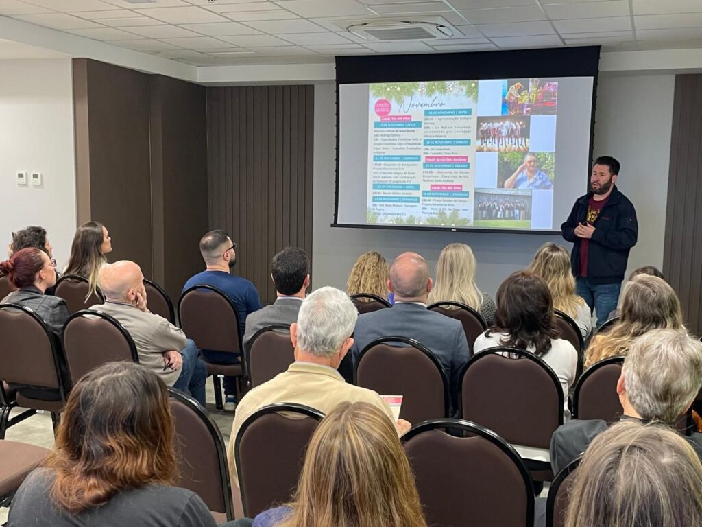 Nesta terça-feira (11) foi realizada a última reunião com o Trade Turístico do ano de 2025. O evento nas dependências do Sicredi – Agência Agro. Foram 7 encontros ao longo do ano, oportunizando um espaço de diálogo e troca entre os diversos setores envolvidos na gestão do turismo do município de Bento Gonçalves. Inicialmente, o Secretário Henrique Núncio apresentou a programação do Natal Bento 2025, trazendo detalhes de todas as atrações que ocorrerão ao longo dos dias 14 de novembro a 23 de dezembro. Após, a Secretária-Adjunta Natália Madalosso trouxe as estatísticas cumulativas desde janeiro até outubro de 2025 quanto à quantidade de visitantes e perfil do turista: como destaque, até o momento, 35,46% dos visitantes são oriundos do Estado. Já o motivo da viagem é, predominantemente, o lazer, representando 74,78%, e o acumulado do ano está em mais de 1,1 milhão de visitantes. Também foram trazidos dados de promoção do destino de Bento Gonçalves, como as Presstrips e Famtours ocorridas, o que envolveu a presença de mais de 100 profissionais, entre os quais jornalistas, influencers e agentes de viagem vindos de vários locais do país e do mundo. Além da participação dos profissionais da Secretaria de Turismo em mais de 20 feiras voltadas para o turismo. Neste sentido, a Diretora da Rede Dall’Onder Hotéis, Maite Dall’ Onder Michelon, e a Gerente Comercial da Giordani Turismo, Cátia Silva de Melo, trouxeram dados e contaram sobre suas experiências e a importância de estarem presentes em feiras e eventos para promoção do destino turístico. Por fim, foi oportunizado um bate-papo com a operadora de turismo Azul Viagens, através do Gerente-Regional André Almeida, o qual trouxe propostas para promover ainda mais nosso município e seus atrativos. Através dos dados concretizados nesta reunião, a Secretaria de Turismo reforça seus princípios em estar constantemente em busca da divulgação e promoção do destino turístico de Bento Gonçalves. Semtur