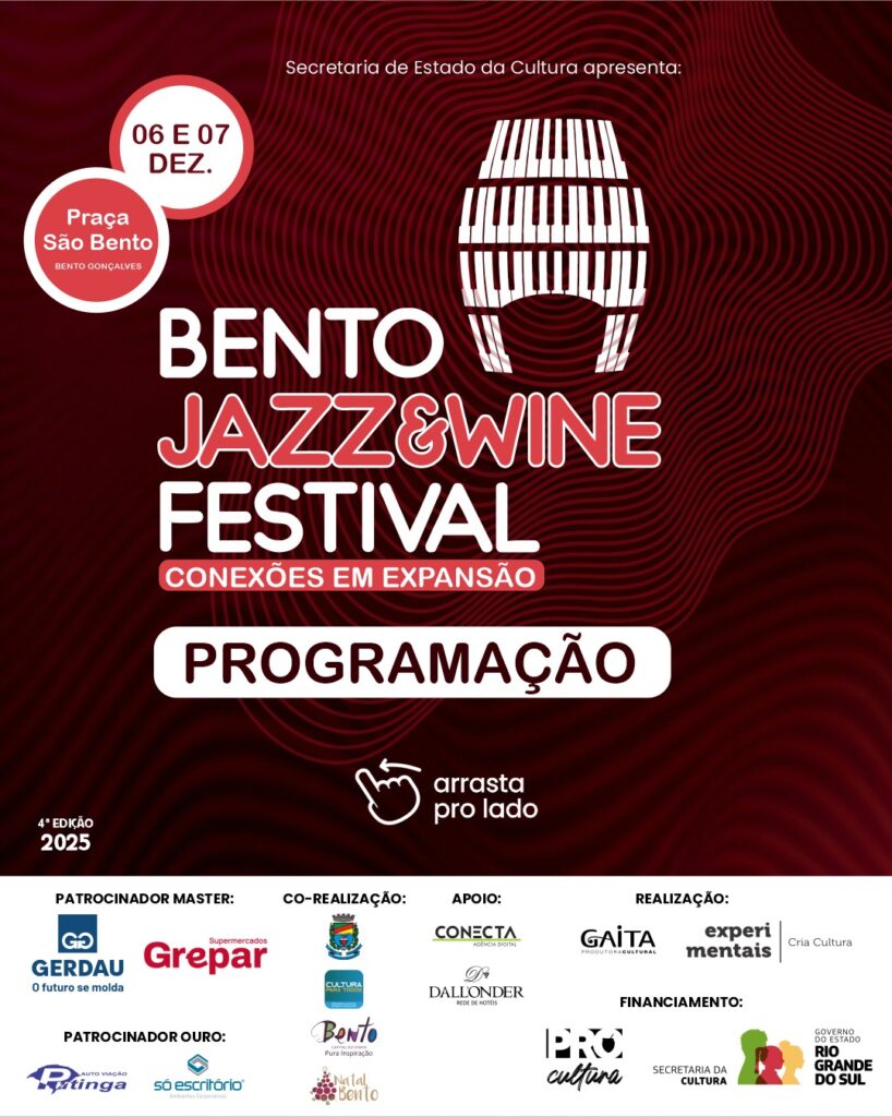 Com o tema Conexões em Expansão, o premiado evento promove uma programação diversa, plural e gratuita Em dezembro ocorre a 4ª edição do Bento Jazz & Wine Festival, evento reconhecido pelo Prêmio Profissionais da Música 2023 como melhor festival de música instrumental do Brasil. Neste ano acontece nos dias 6 (sábado) e 7 (domingo) de dezembro, a partir das 16 horas, na Praça São Bento, também conhecida como Praça da Igreja da Pipa, reunindo música, arte e cultura, ou pelo seu nome oficial Achylles Mincarone. O evento é aberto ao público e gratuito. Com o tema Conexões em Expansão, o Festival traz uma diversidade instigante de sonoridades ligadas ao Jazz, que vai do som do Blues de New Orleans, ao Jazz clássico de standards e a música gaúcha tradicional instrumental, passando pela música instrumental brasileira e o RAP, com apresentações musicais de Rafael Teclas, ATAIRU, Adriana de Los Santos, BRazznRAP, O Som do Vento, Mari Kerber Trio, Felipe Coelho e Luciano Leães. Realizado na Capital Nacional do Vinho, o evento busca também conectar essas duas culturas, a da música e a do vinho, de forma orgânica, com a presença de diversas vinícolas, oferecendo ao público o melhor da produção vitivinícola gaúcha. Paralelamente, serão promovidas duas master classes com os músicos Alex Zanotelli e Uiliam Michelon, e dois debates para analisar e discutir o mercado cultural e os mecanismos de fomento, os desafios e oportunidades no ensino da música na atualidade. Também serão ministradas, pelo professor Alison Seben, uma série de oficinas para crianças da rede municipal de ensino. Todas as ações podem ser acompanhadas pelas redes sociais do projeto @bentojazzwine. O Festival, inserido na Programação Oficial do Natal Bento, tem patrocínio master de Gerdau e Super Grepar, Patrocínio Ouro de Autoviação Putinga e Só Escritório, por meio do financiamento Pró-Cultura RS – SEDAC e Governo do Estado do Rio Grande do Sul. A realização é de Experimentais CriaCultura e Gaita Produtora, com o apoio da Prefeitura de Bento Gonçalves, Secretaria da Cultura de Bento Gonçalves e Secretaria de Turismo de Bento Gonçalves. Financiamento: Pró-Cultura RS | SEDAC e Governo do Estado do Rio Grande do Sul Patrocinador Master: Gerdau | Super Grepar Patrocinador Ouro: Autoviação Putinga | Só Escritório Realização: Experimentais CriaCultura | Gaita Produtora Co-Realização: Prefeitura de Bento Gonçalves | Secretaria da Cultura de Bento Gonçalves | Secretaria de Turismo de Bento Gonçalves | Natal Bento Apoio: Conecta Agencia | Rede de Hotéis Dall’onder