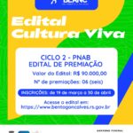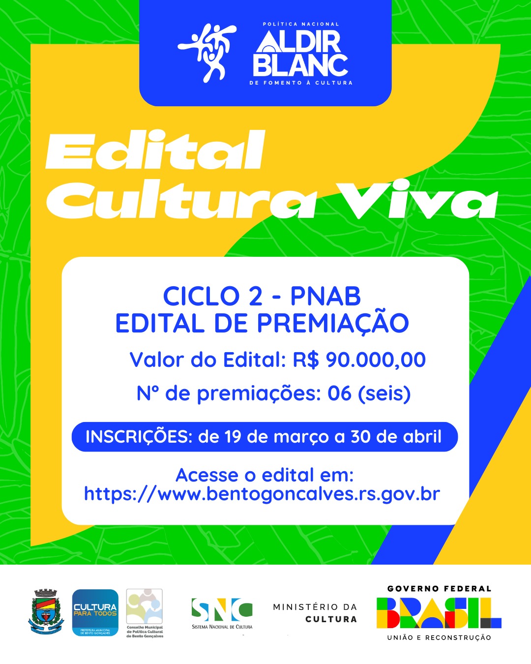 Os editais completos e mais informações podem ser acessados em https://www.bentogoncalves.rs.gov.br/pnab-politica-nacional-aldir-blanc/