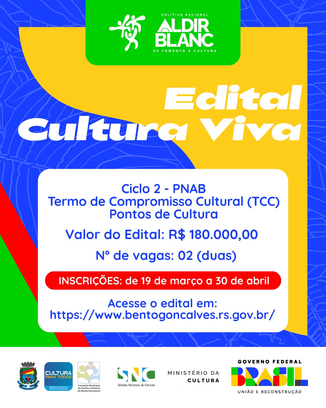 A Secretaria Municipal de Cultura de Bento Gonçalves abre, de 19 de março a 30 de abril de 2026, as inscrições para dois editais de chamamento público da Política Nacional de Cultura Viva, viabilizados com recursos do ciclo 2 da Política Nacional Aldir Blanc de Fomento à Cultura (PNAB), do Ministério da Cultura. Ao todo, serão destinados R$ 270 mil a iniciativas culturais de base comunitária no município.