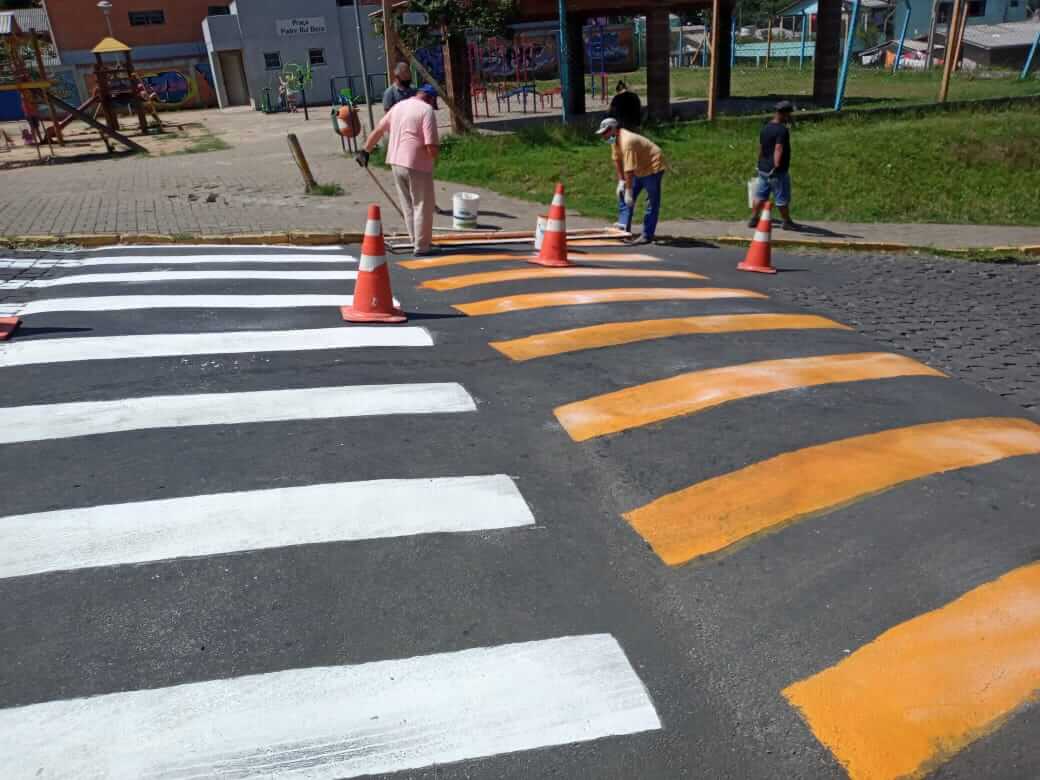 A Secretaria de Gestão Integrada e Mobilidade Urbana segue com os serviços de pintura e manutenção da sinalização nos bairros do Município. São realizadas a pintura de faixas de segurança e no entorno das escolas, já preparando para o retorno das aulas no próximo mês.