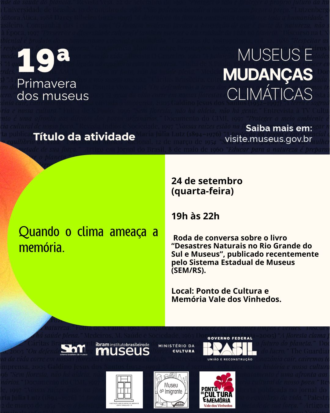 No dia 24 de setembro, a partir das 19h, no Ponto de Cultura mencionado, terá a roda de conversa sobre o livro “Desastres Naturais no RS e Museus” (SEM/RS), abordando sobre os impactos da crise climática e debatendo estratégias coletivas de prevenção e gestão de riscos.