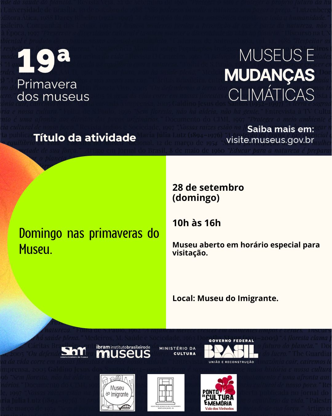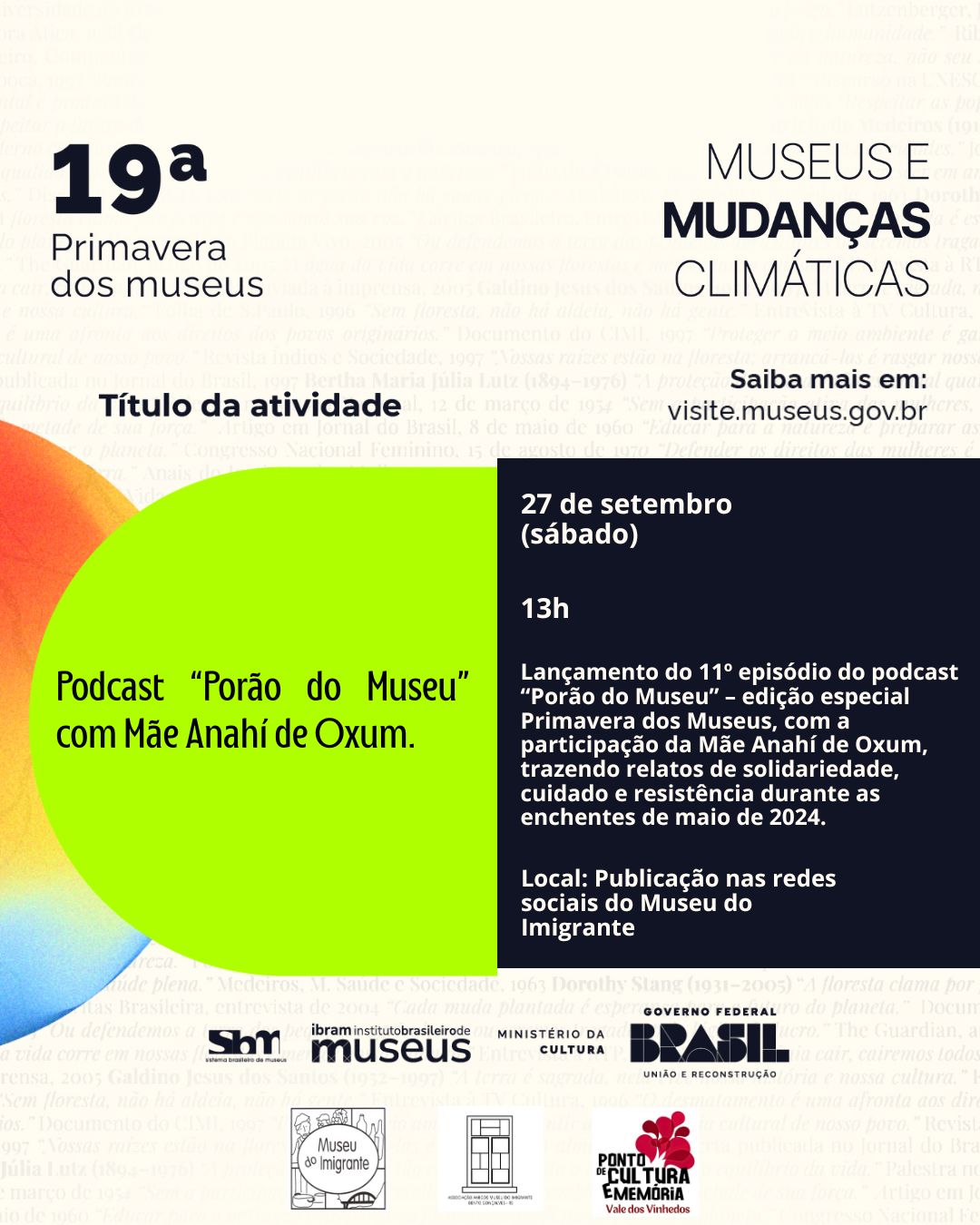 No dia 27 de setembro, às 13h, será lançado o 11º episódio do podcast “Porão do Museu” – edição especial Primavera dos Museus, com a participação da Mãe Anahí de Oxum, trazendo relatos de solidariedade, cuidado e resistência durante as enchentes de maio de 2024. O podcast poderá ser acessado pelas redes sociais da instituição. No dia 28 de setembro, das 10h às 16h, o Museu do Imigrante estará aberto para visitação, em horário especial.
