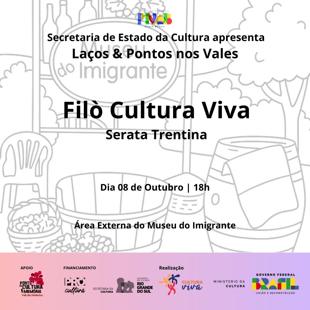No mesmo dia, ocorre na área externa do Museu, o Filò Cultura Viva – Serata Trentina, a partir das 18h, por meio do projeto Laços & Pontos do Vale.