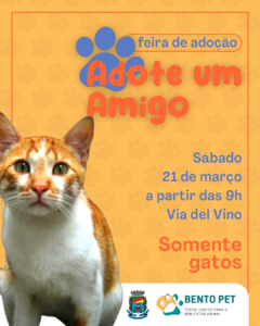 Neste sábado (21), será realizada na Via del Vino a edição do Bento Pet- adote um amigo, exclusiva para gatos....