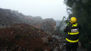 Equipes da Defesa Civil e bombeiros trabalham no local