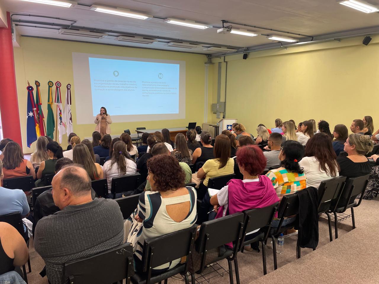Nesta quarta-feira (25), ocorreu no Auditório do Bloco J da Universidade de Caxias do Sul – Campus Bento Gonçalves a abertura do curso do Programa de Formação em Gestão Educacional, tendo como público-alvo diretoras, vice-diretoras, assessoras pedagógicas e supervisoras, englobando mais de 200 profissionais. Em parceria com o Sicredi Serrana RS/ES, está sendo ministrado pela doutora na área da gestão escolar Viviane Klaus. Após o término da capacitação, vai ocorrer nos educandários as assessorias in loco, onde cada contexto será levado em consideração.