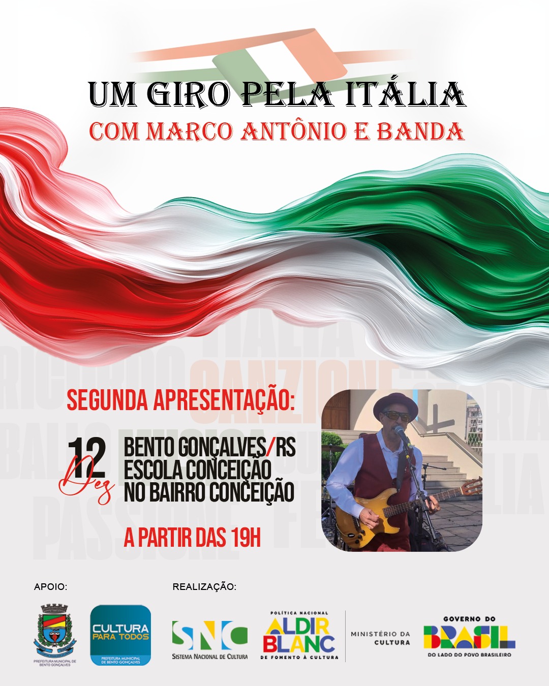 O projeto “Um Giro pela Itália com Marco Antônio e Banda”, viabilizado pela Política Nacional Aldir Blanc de Fomento à Cultura por meio do Edital 06/2025 de Bento Gonçalves, segue levando música, arte e memória às comunidades do município. Após a estreia na Praça da Igreja São Roque, o circuito realiza sua segunda apresentação na sexta-feira, 12 de dezembro de 2025, às 19h, no Ginásio da Escola do Bairro Conceição.